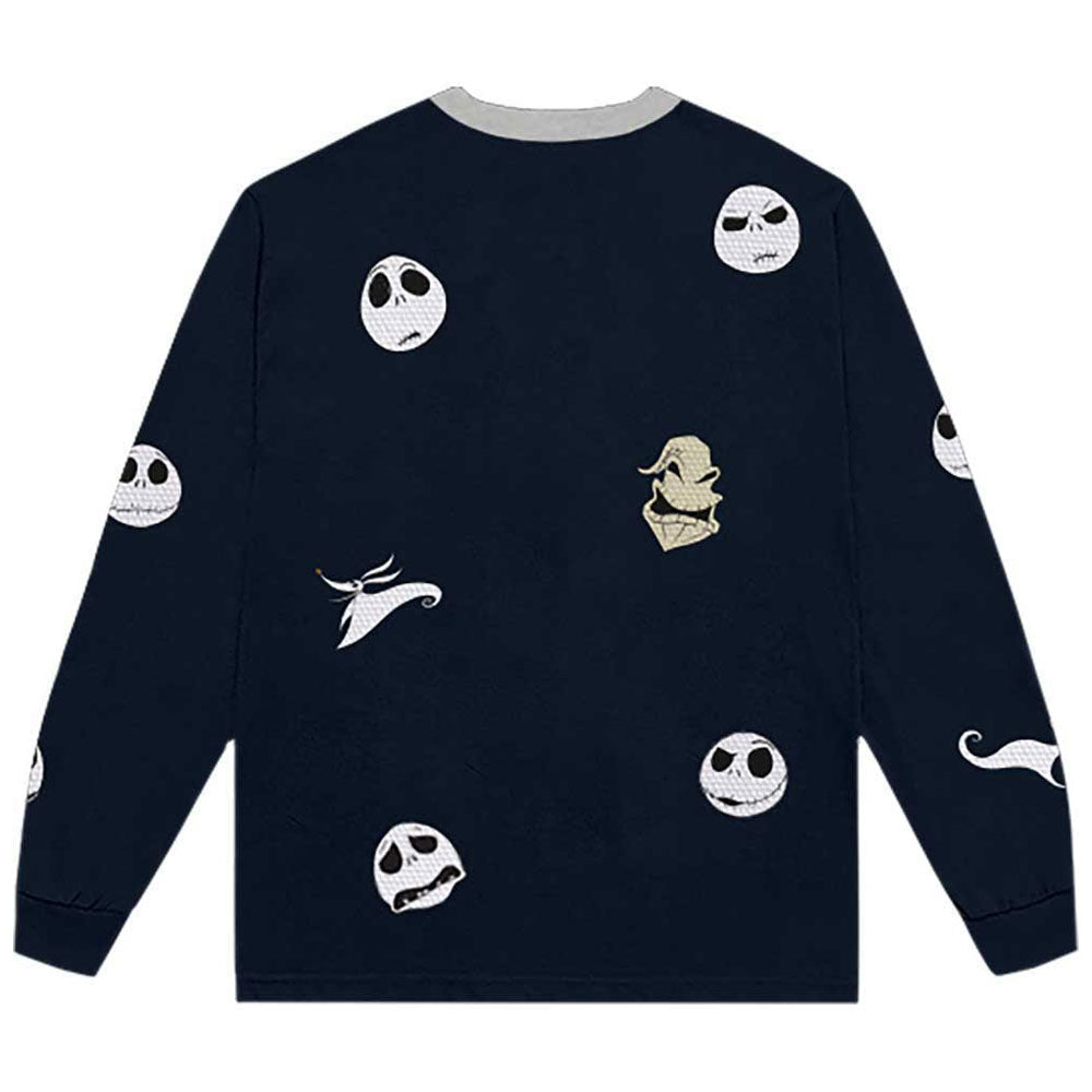 Official licensed The Nightmare Before Christmas Unisex Long Sleeve T-Shirt featuring the 'Character Heads' design motif. High quality Long Sleeve T-Shirt available in a navy blue colourway. High quality soft-style cotton unisex long sleeve t-shirt featuring sleeve, front & back printing, with contrasting crew neck collar. Embroidery to all characters. Comes in a wide range of sizes from Small through XX-Large, subject to availability.