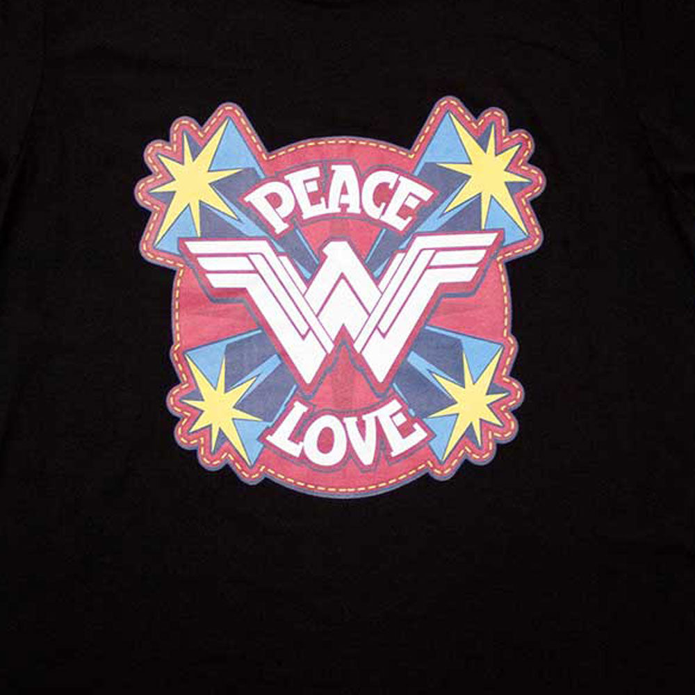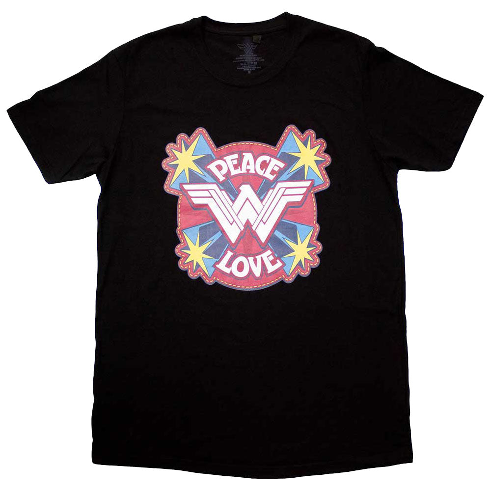 Official licensed DC Comics Unisex T-Shirt featuring the 'Wonder Woman Peace & Love' design motif. High quality T-Shirt available in a black colourway. High quality soft-style cotton unisex t-shirt featuring front printing. Comes in a wide range of sizes from Small through XX-Large, subject to availability.