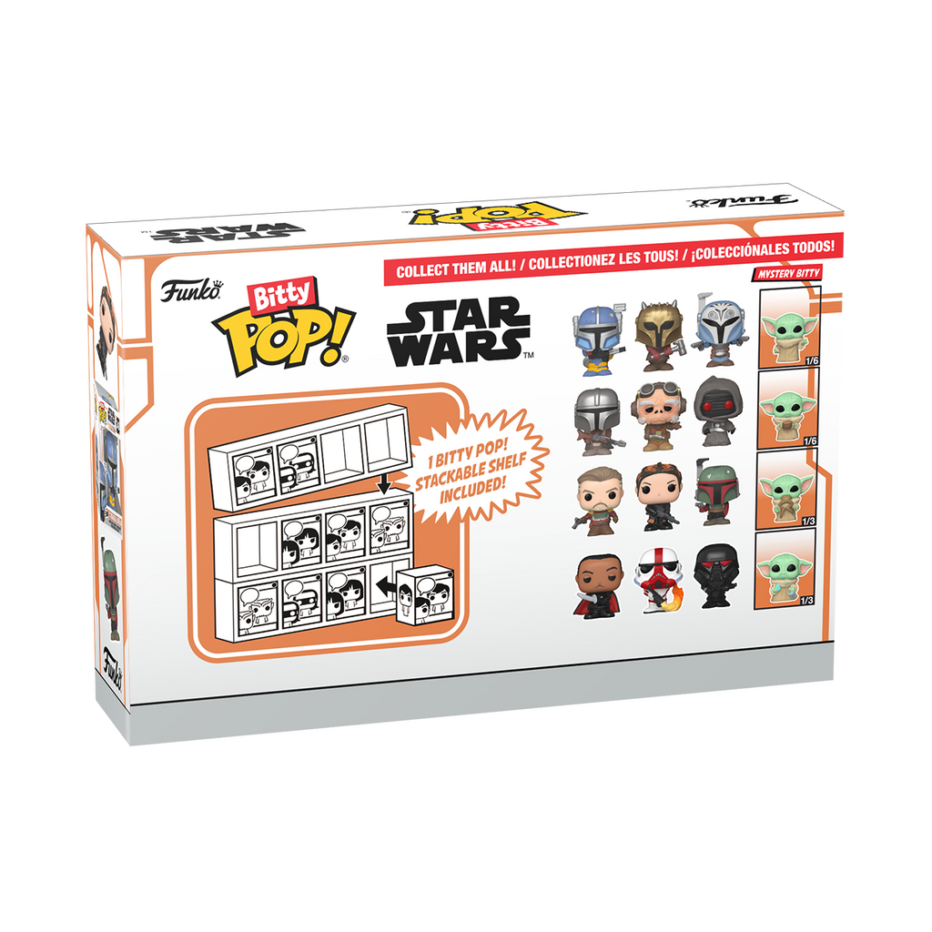 This 4-pack includes Bitty Pop! Heavy Infantry Mandalorian, The Armorer, Bo-Katan Kyrze, and one mystery figure. The possible mystery Bitty Pop! could be: Hyper Rare Grogu (1/6), Hyper Rare Grogu w/Cup (1/6), Rare Grogu w/Frog (1/3), and Rare Grogu w/Cookie (1/3).