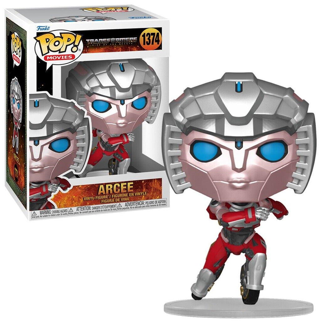 Arcee Transformers: Rise of the Beasts Funko Pop! Movies Vinyl Figure measures approximately 10 cm tall and comes packaged in a cardboard box with display window.