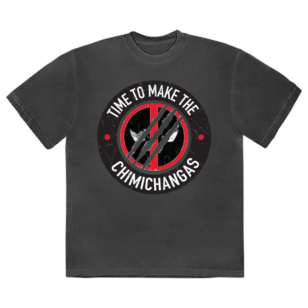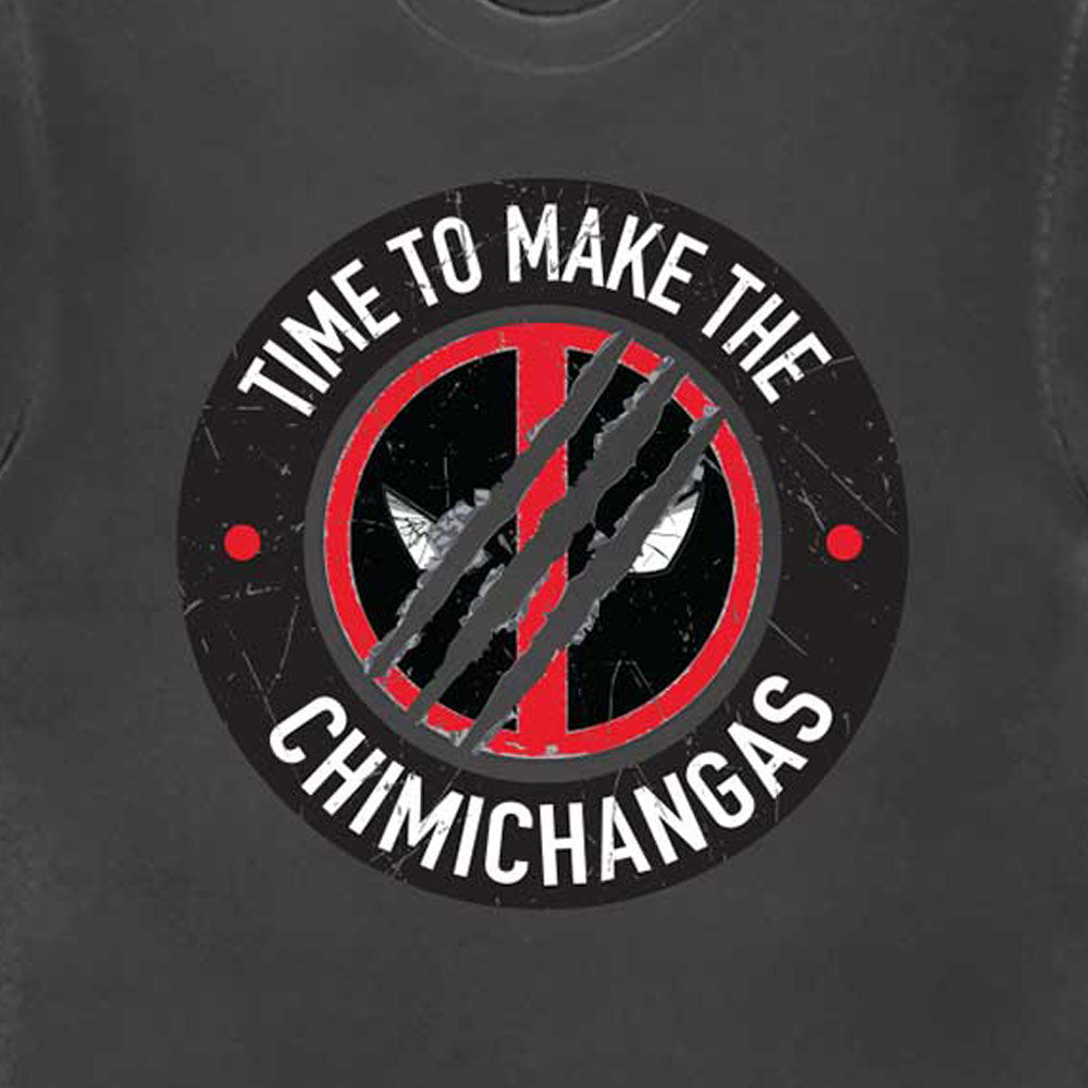 Official licensed Marvel Comics Unisex T-Shirt featuring the 'Deadpool Chimichanga' design motif. High quality T-Shirt available in a charcoal grey colourway. High quality soft-style cotton unisex t-shirt featuring front printing. Comes in a wide range of sizes from Small through XX-Large, subject to availability.