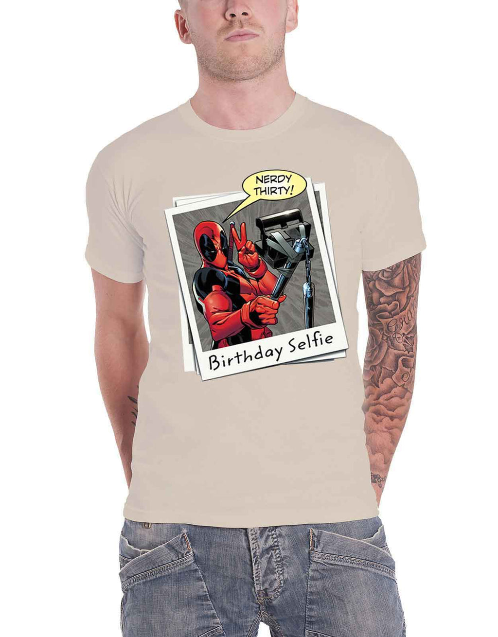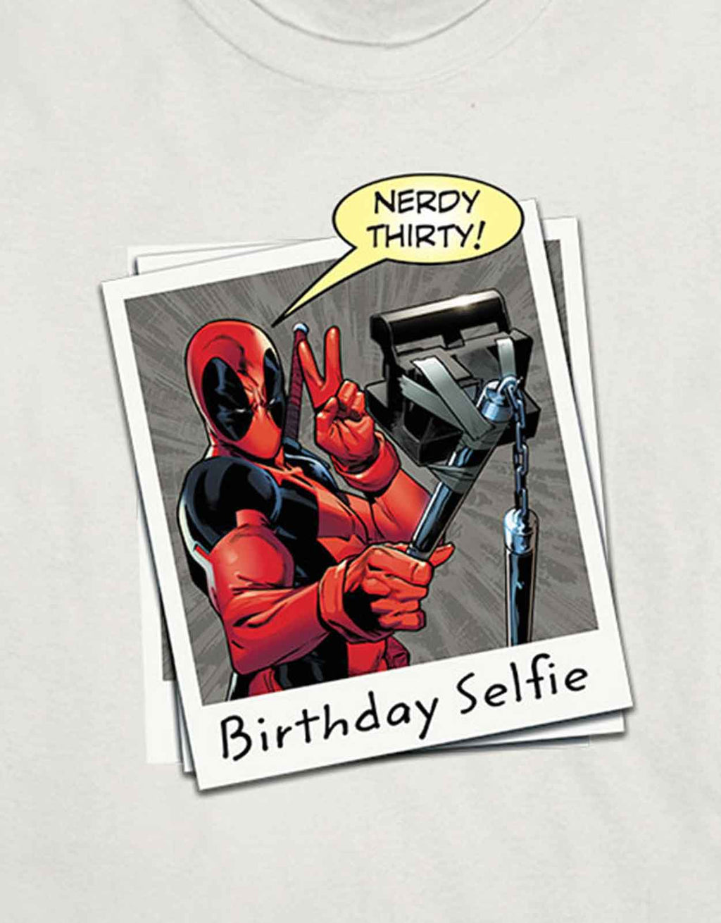 An official licensed Marvel Comics Unisex Tee featuring the 'Deadpool Birthday Selfie' design motif. This high quality t-shirt design is available in the ecru colourway. Classic unisex fit soft-style cotton tshirt featuring short sleeves and crew neck. Deadpool is a American superhero film based on the Marvel Comics character of the same name. Comes in a wide range of sizes from Small through XX-Large, subject to availability.